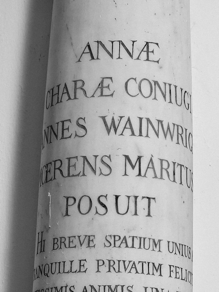 By the north door is an unusual columnar monument commemorating Anne Wainwright:-
