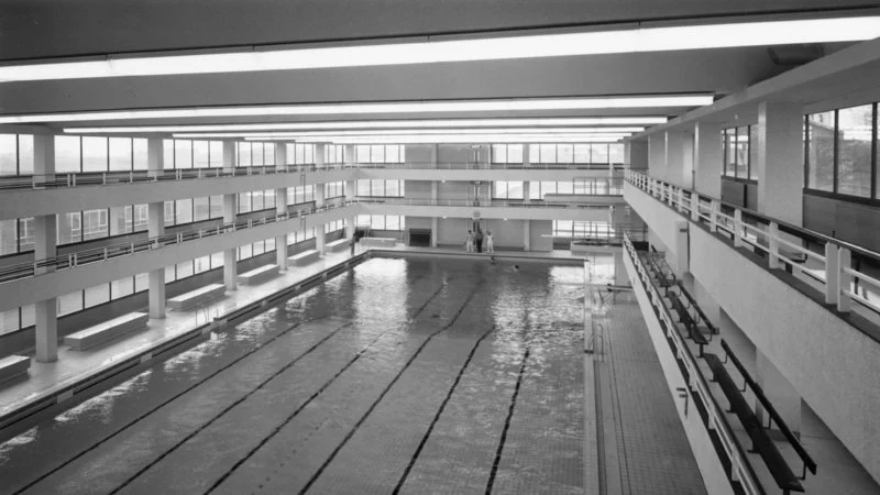 Its architect, Reginald Uren is an interesting figure. Born in New Zealand, he was trained as an architect there before coming to London in 1929 to study at the Bartlett and work for Charles Holden on some of the stations on the Piccadilly Line. In 1933, he won the competition to design Hornsey Town Hall which he did in a grandly Scandinavian style. In the 1950s, his firm, Slater, Uren and Pike, was responsible for the design of John Lewis and additions to Peter Jones. The swimming baths were designed in the mid-1960s.