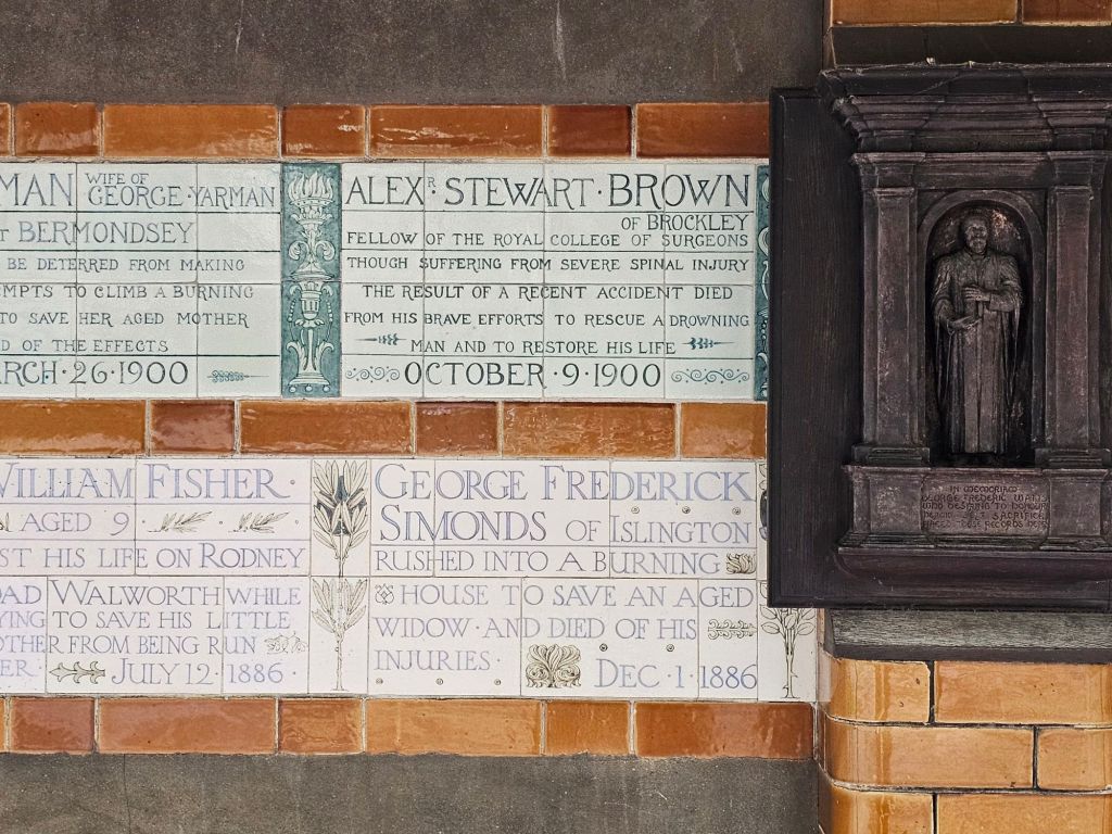 This year, I walked through Postmen’s Park which idiotically I knew about, but had never seen: G.F. Watts’s idea of commemorating the unsung heroes and heroines who lose their lives in saving the lives of others.