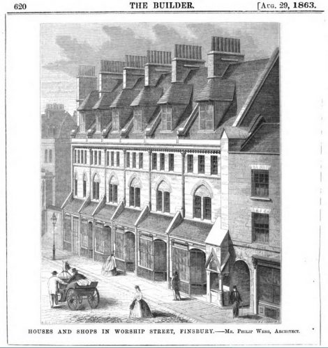 Many is the time that I have walked past Worship Street (originally Hog Lane) in the heart of Shoreditch without realising that the plain and undemonstrative group of buildings on its north side are the work of Philip Webb, friend of William Morris and one of the greatest Arts-and-Crafts architects – indeed one of the progenitors of the arts-and-crafts movement. He designed them for Lieutenant-Colonel William Gillum, with shops in the front, workshops to the rear and flats above:-