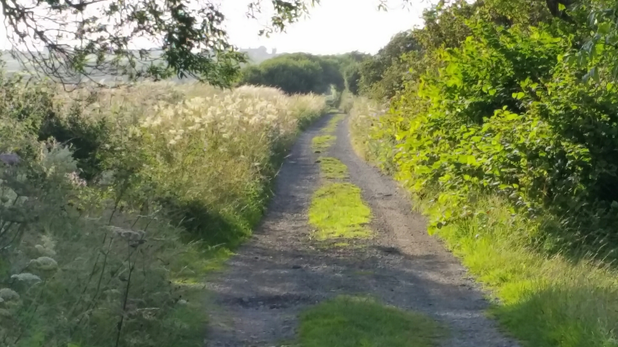 You approach up a long drive with moss-covered banks which open up to fields:-