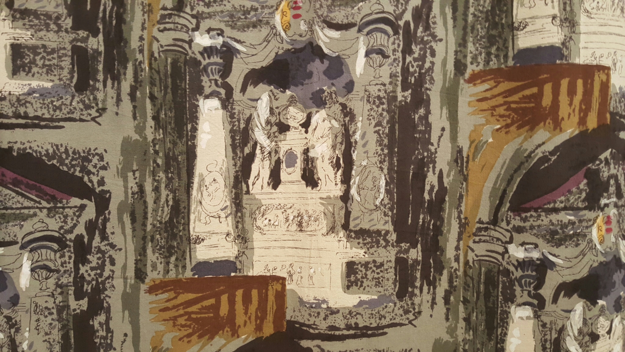 Piper’s first work as a textile designer was for Zika and Lida Ascher who had set up a silk-printing business in London after emigrating from Czechoslovakia. In 1947, they organised an exhibition of printed textiles at the ICA. In the 1950s, he also worked for David Whitehead Ltd., a textile company in Lancashire for whom he did beautiful textile designs of, for example, Grinling Gibbons’s spectacular monument to Baptist Noel, third Viscount Campden in Exton church in Rutland:-