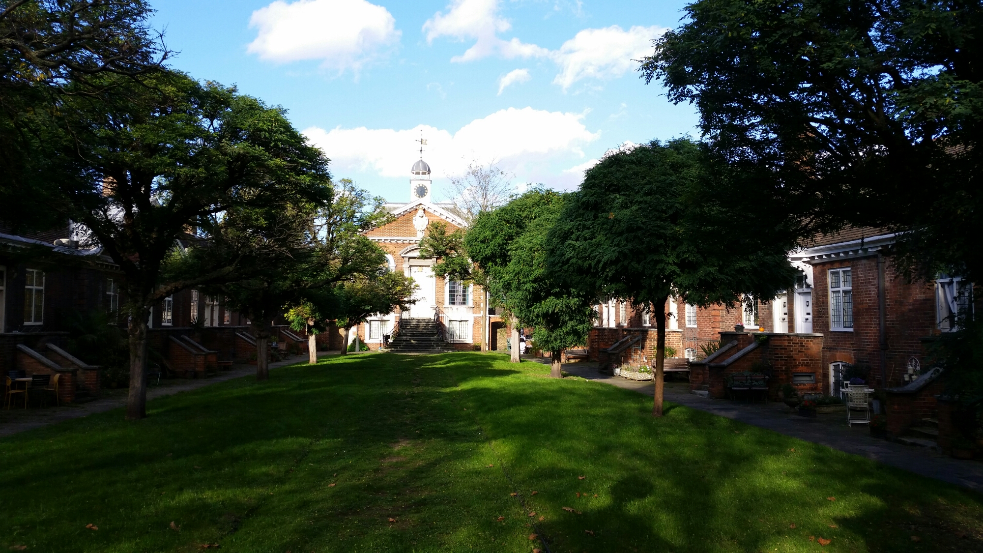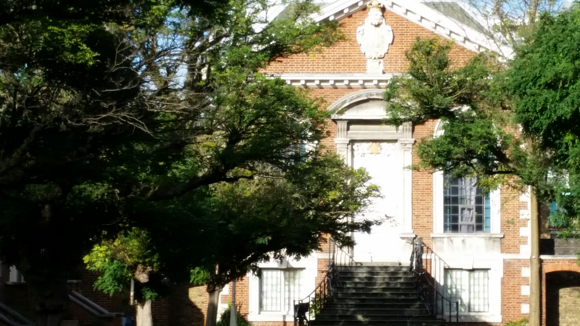 I walked past the almshouses at Trinity Green this afternoon. They looked particularly fine in the late autumn sun, with the grass grown long in front of the chapel. Established by the will of Captain Henry Mudd of Ratcliffe for ’28 decayed masters and commanders of ships or the widows of such’, there are model ships, fibreglass copies of the marble originals, on the parapet. What is not recorded is that the almshouses were saved as a result of the energies of C.R. Ashbee who wrote The Trinity Hospital in Mile End: An object lesson in national history as the first volume of the Survey of London, published in 1896 by his Guild of Handicraft in Bow: