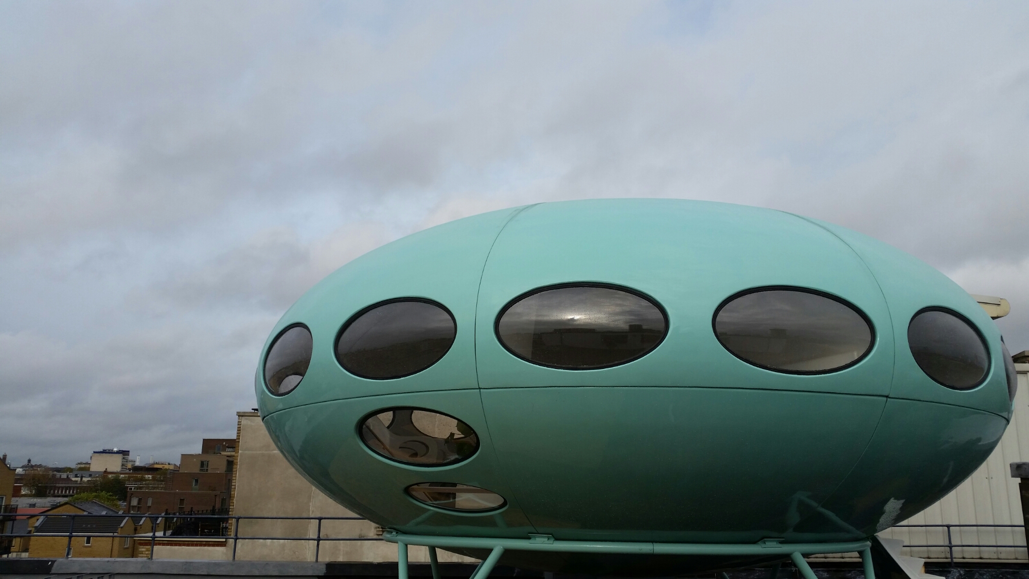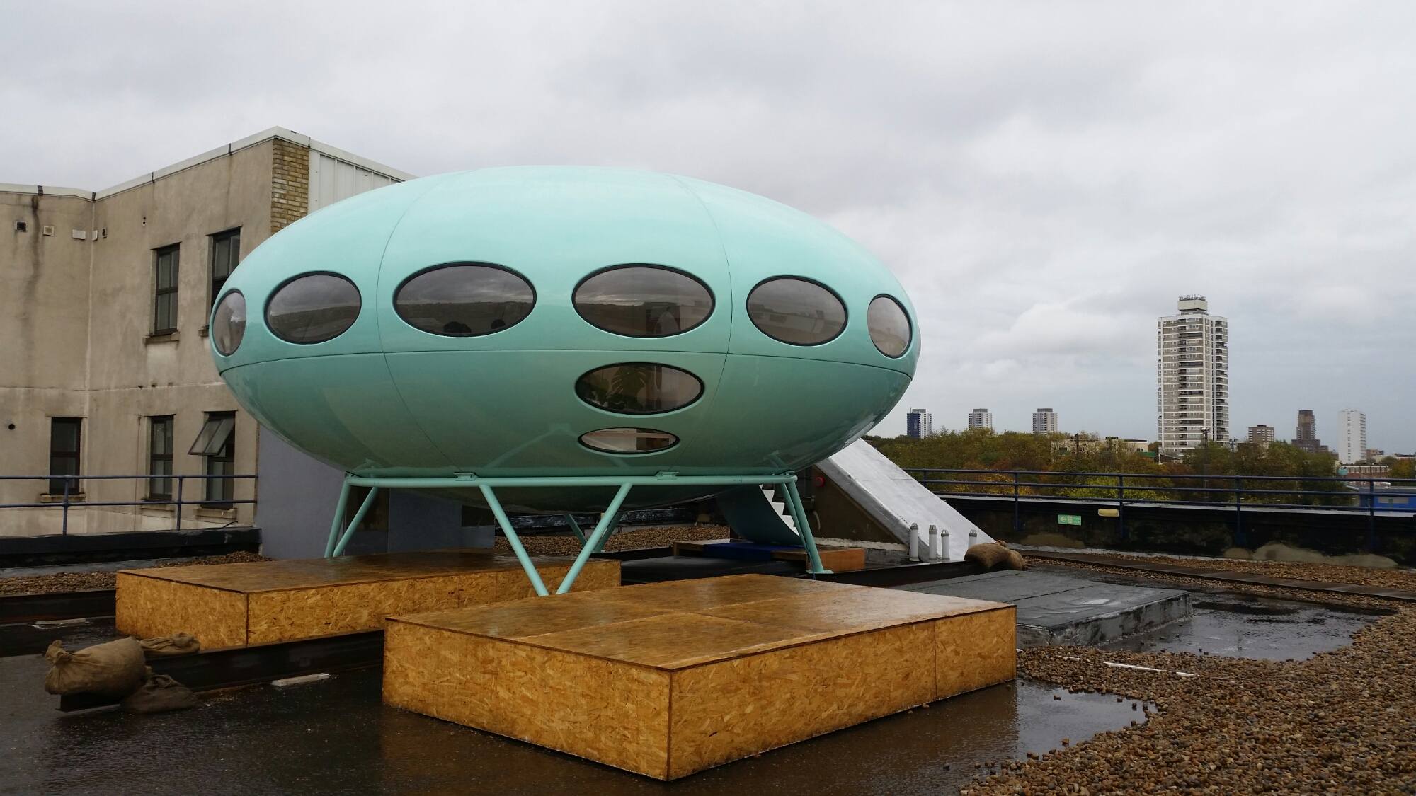 We went on a little excursion this morning to see the Futuro House which looks as if it’s landed like an alien spacecraft on the roof of Matt’s Gallery next door to the Ragged School Museum on the Regent’s Canal. The first Futuro House was designed in the 1960s in Finland as a ski cabin and they were then manufactured as cheap homes. But they were so unpopular that they were subjected to drive-by shootings in the United States. This one was found ruined in South Africa and has been meticulously restored by Craig Barnes, an architect, maybe as an example of cheap manufactured homes: