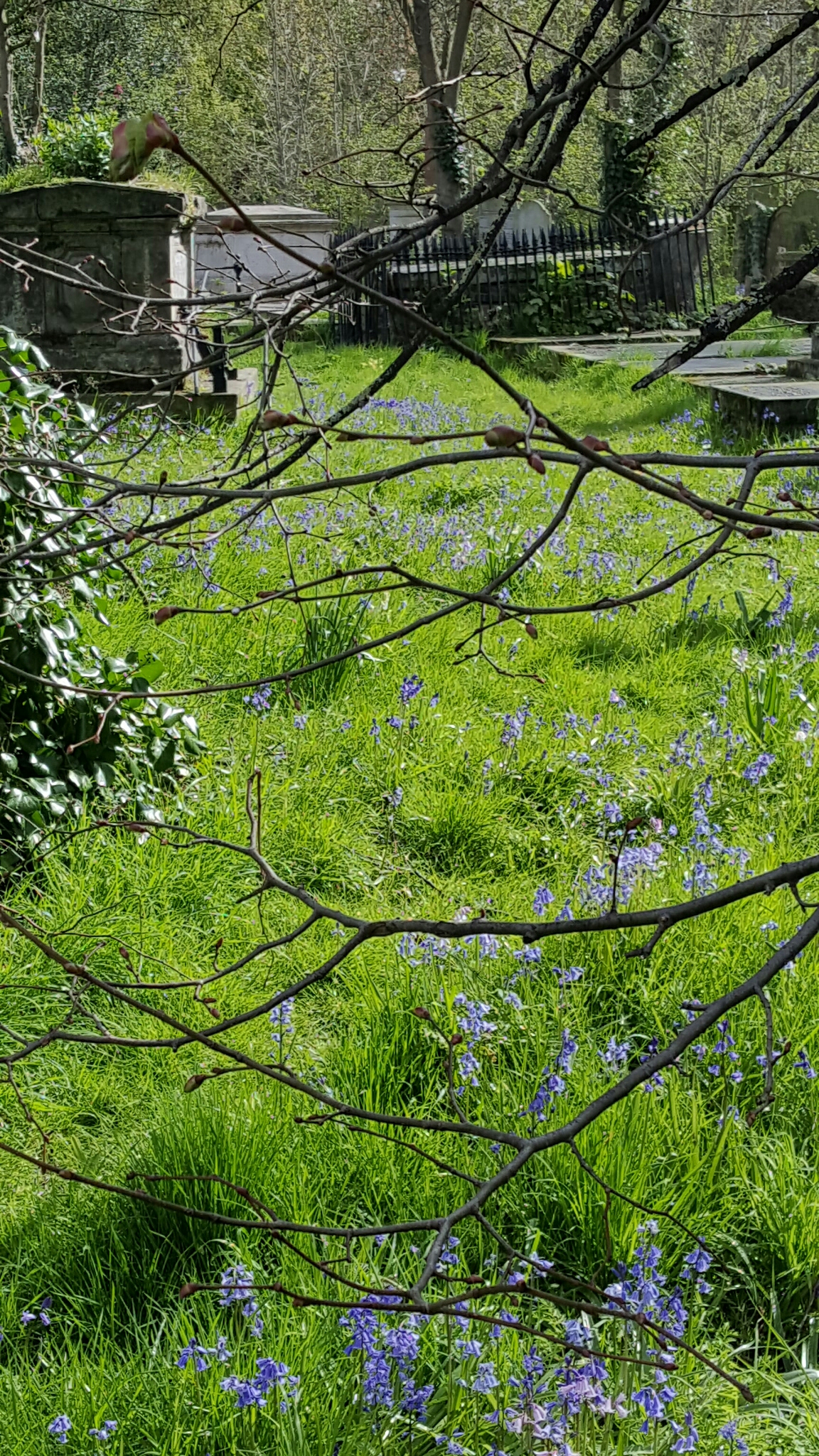 I have done posts on Tower Hamlets cemetery before, but never when it has been covered by bluebells, so that it is a curious mixture of the melancholy memorials of old East Enders, multicultural even in the nineteenth century, together with rampant spring:-