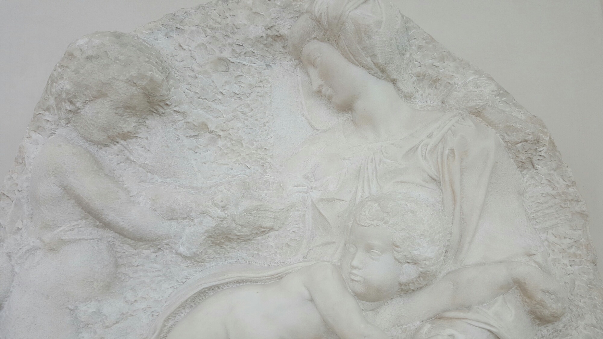 Today for the first time since it was installed behind bullet-proof glass upstairs in the Sackler Gallery in 1991, the glass was taken off the display case of Michelangelo’s Tondo, so that one could see it in its full, fresh and rough-hewn glory. We were told its history in the RA: bought by the artist and collector, George Beaumont, in Rome in 1822; shown in his house in Grosvenor Square; bequeathed on his death in 1827 to the RA; hung on the top floor of Burlington House in the late nineteenth century and in the General Assembly Room after the war; occasionally exhibited, as, for example, in the great Italian Art exhibition in 1930. It certainly looks very different out from behind glass, some parts finished and polished, much of it still waiting the chisel:-
