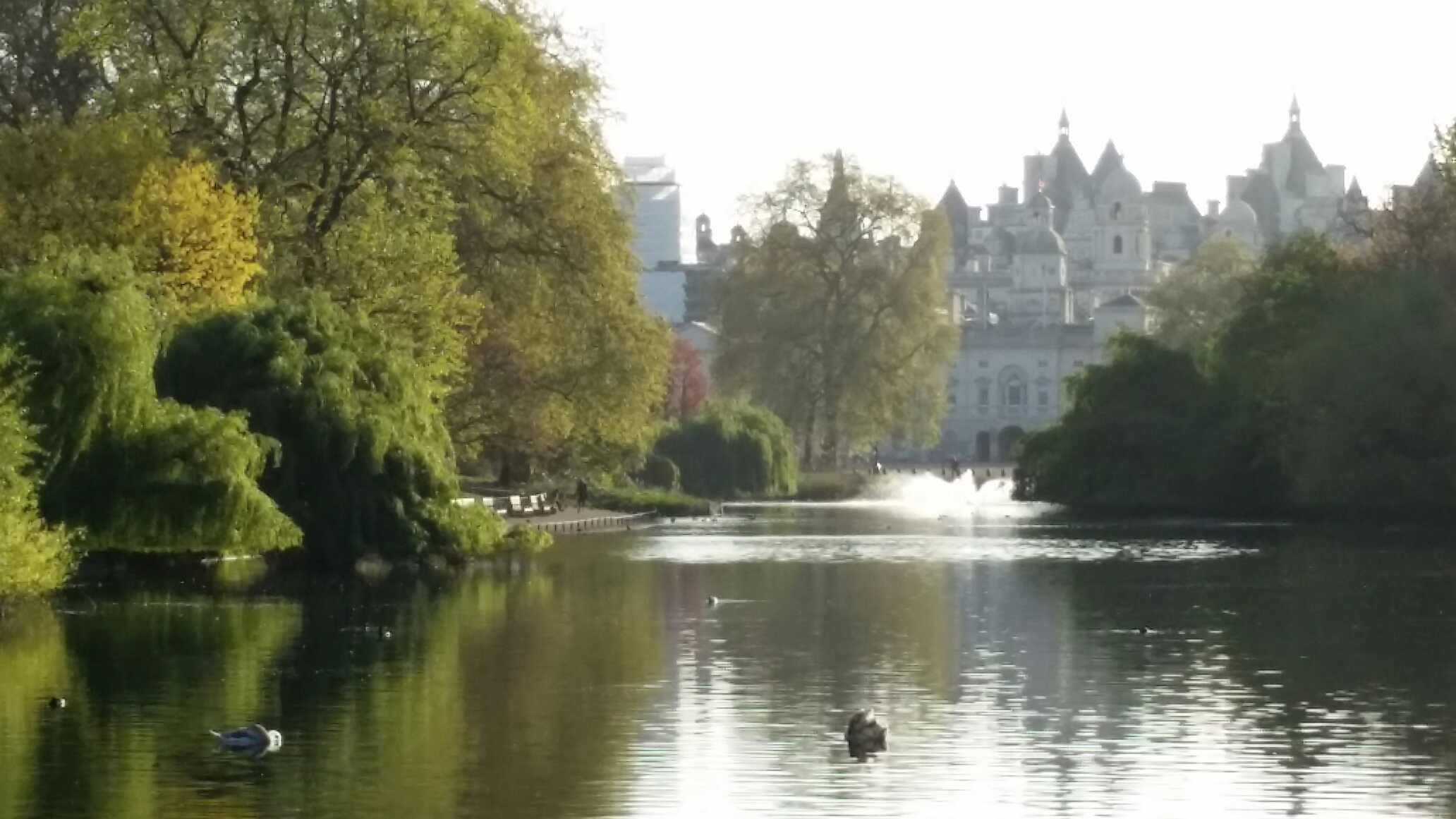I normally walk across St. James’s Park in the early morning. How different it looks in the evening sun: