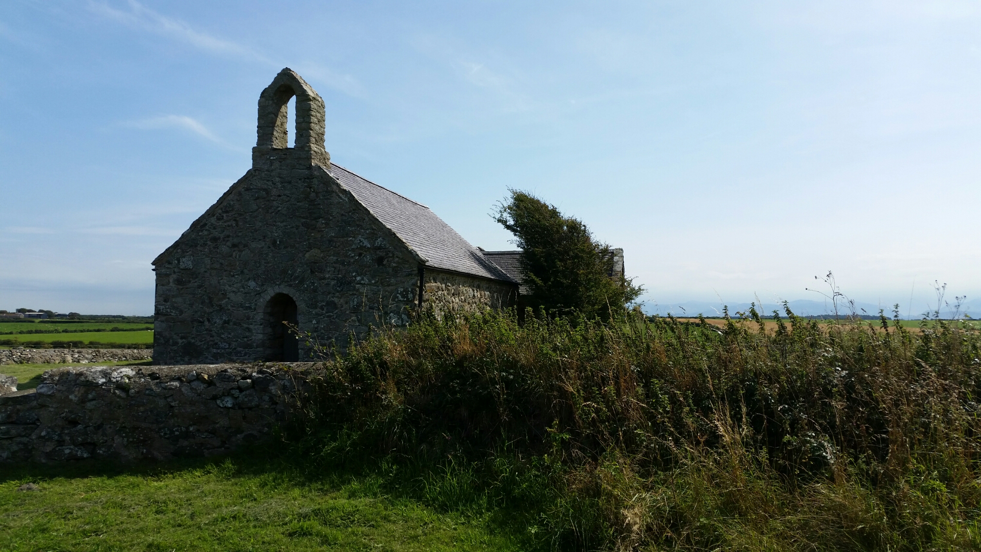 I discovered the church of St. Mary, Tal-y-llin in the Shell Guide’s entry for Aberffraw. It’s actually on a deserted road about three miles north- north-east of Aberffraw unmarked by the Ordnance Survey. It’s a magical place, looked after by the Friends of Friendless Churches and miraculously open, not just to visitors, but to the fields. Empty of any paraphernalia except a deep and rural piety:-
