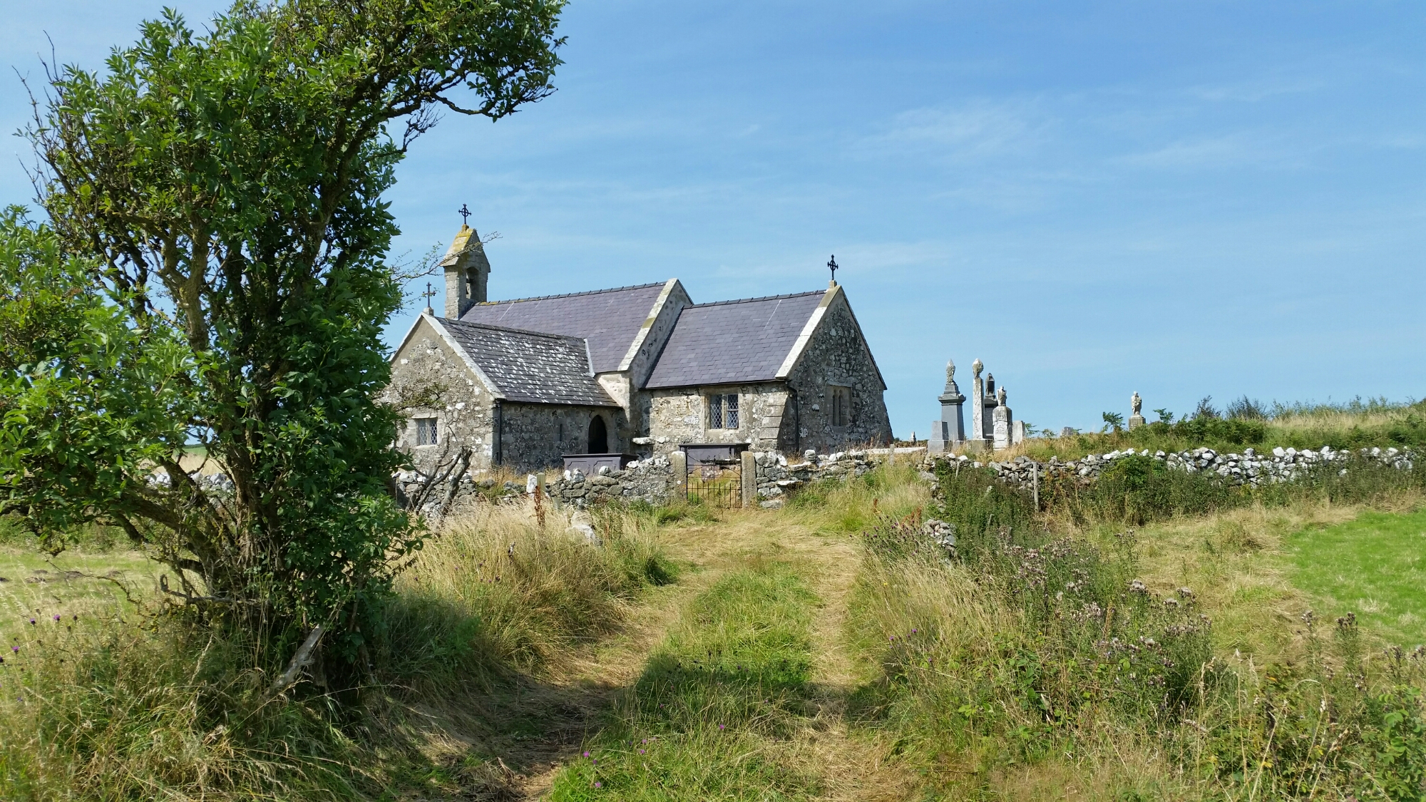 We went on our annual visit to Penmon to see the lighthouse and eat a bacon bap at the Pilot Café. We stopped at St. Seiriol to admire the Romanesque church first established by King Einion in the early sixth century and re-established as an Augustinian Priory in the 1220s. It’s satisfyingly simple, on the edge of the Straits, with the Prior’s House still occupied, but not by a Prior, next door:-